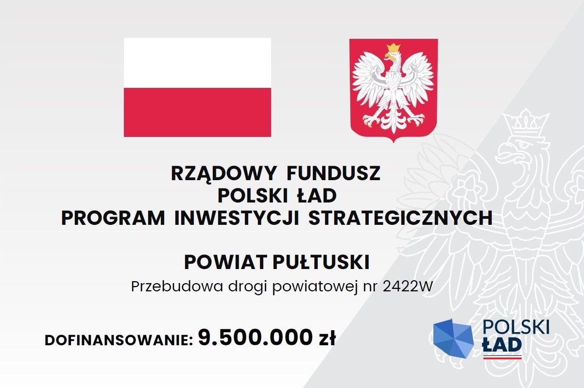 Powiat Pułtuski we IX. 2022 r. uzyskał w ramach Rządowego Funduszu Polski Ład: Program Inwestycji Strategicznych z Banku Gospodarstwa Krajowego promesę finansową na realizację robót budowlanych dotyczących zadania pn. "Przebudowa drogi powiatowej nr 2422W". Kwota promesy finansowej wynosi 9.500.000 zł. Środki pochodzą z Funduszu Przeciwdziałania COVID-19.